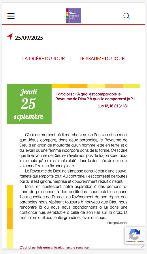 Chaque jour, www.painquotidien.net propose un extrait de la Bible, un texte de méditation rédigé par un pasteur, un extrait de psaume ou de cantique et une proposition de prière téléchargeable au format PDF (issue du Livre de prières)