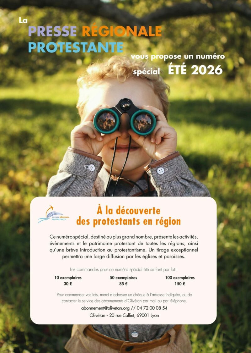 À l’occasion de la période estivale, la presse régionale protestante prépare un numéro spécial destiné à mettre en lumière les activités, initiatives, événements ainsi que le patrimoine protestant présents sur l’ensemble de nos territoires. Il est proposé aux paroisses de le précommander par lots afin d’en assurer une large diffusion.